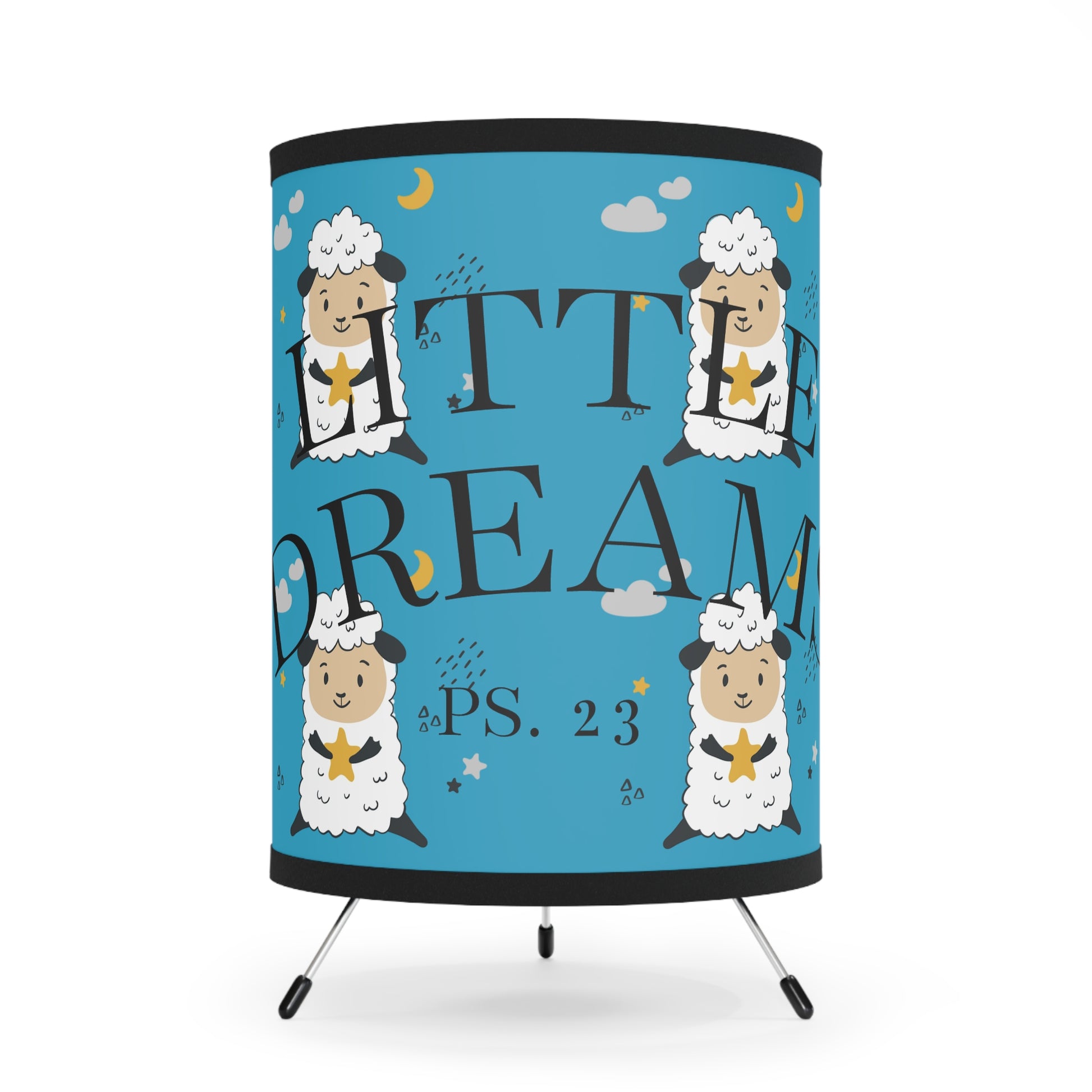 Soft, sleepy light wrapped in a joyful, hand-drawn scene. This tripod lamp brings a gentle blue glow and bubbly sheep characters into a child’s corner, nursery, or cozy reading nook. The high-resolution polyester shade showcases an all-over print of smiling lambs, tiny moons and stars, and a subtle script nod to Psalm 23 — all trimmed with black top and bottom bands for a polished look. The galvanized steel tripod base keeps the lamp steady while the warm light peeking through the fabric creates a calm, bedtime atmosphere that invites quiet stories, slow breaths, and sleepy smiles.